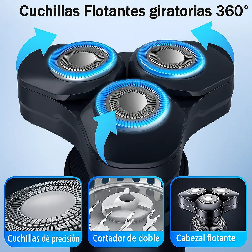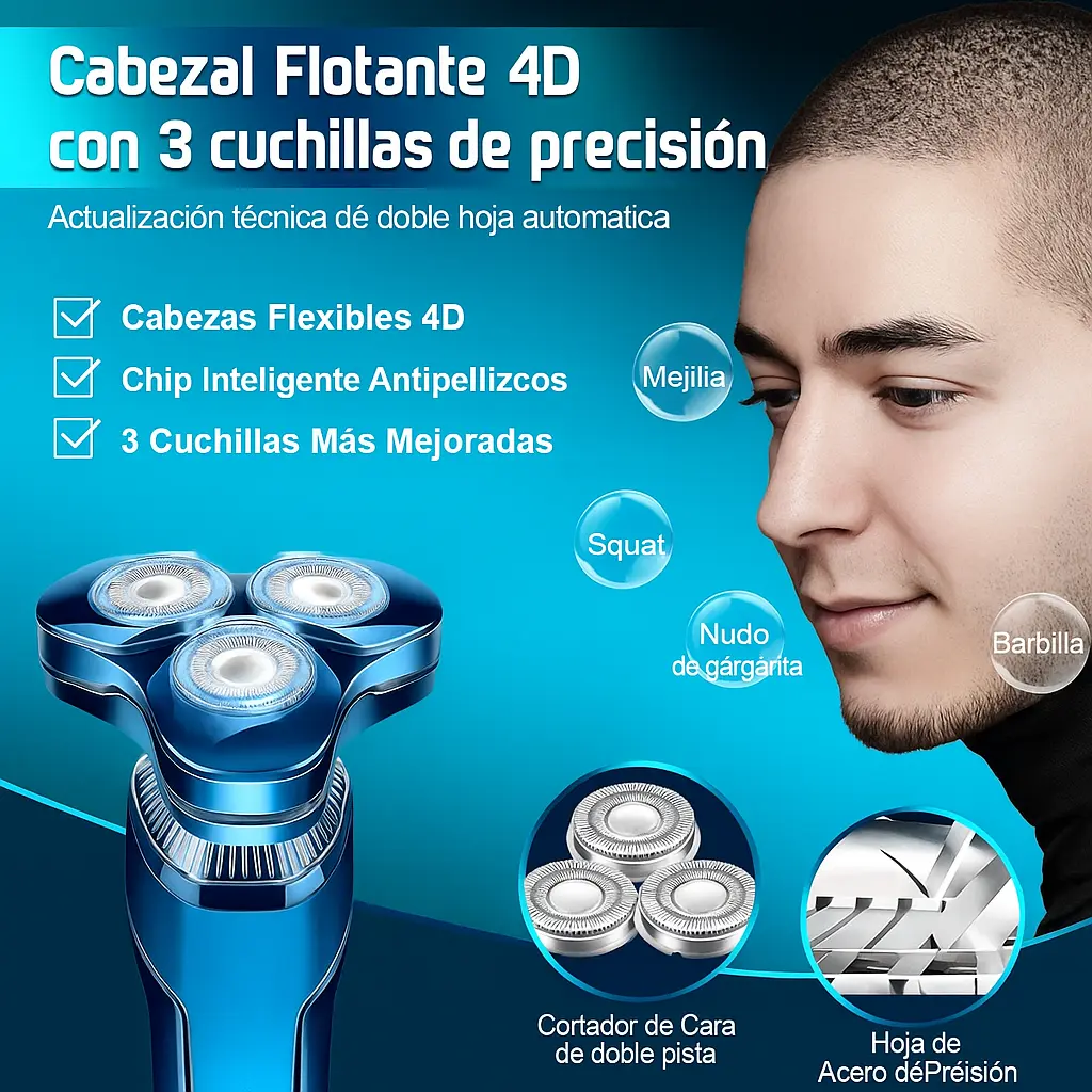 El cabezal flotante 4D se ajusta automáticamente a los contornos del rostro, cuello y mandíbula, garantizando un afeitado preciso, suave y uniforme. Solo tienes que acercar la afeitadora al rostro, y su sistema de alineación magnética se encargará del resto.