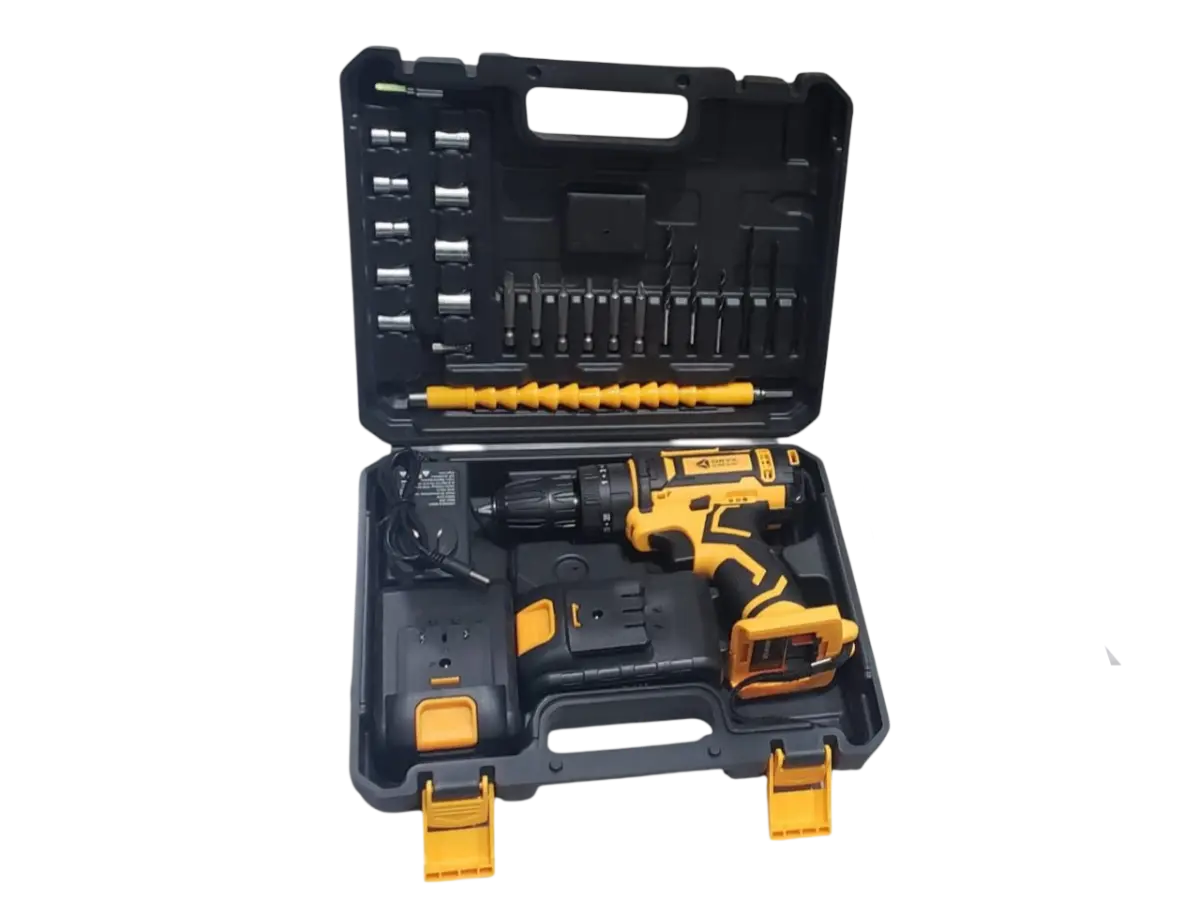 Este versátil kit ofrece un taladro percutor inalámbrico con batería recargable, cargador y una amplia selección de accesorios (puntas, brocas y dados) en un estuche robusto. Es ideal para tareas domésticas de atornillado y perforación ligera a media.
